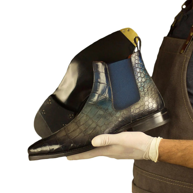 Introducing our expertly crafted Navy Blue Patina Leather Haskovo Chelsea Boots. Made with premier leather, these boots feature a unique navy blue patina that adds a touch of intrigue. With their classic Chelsea style and durable construction, these boots are sure to elevate any outfit while providing long-lasting comfort and quality.