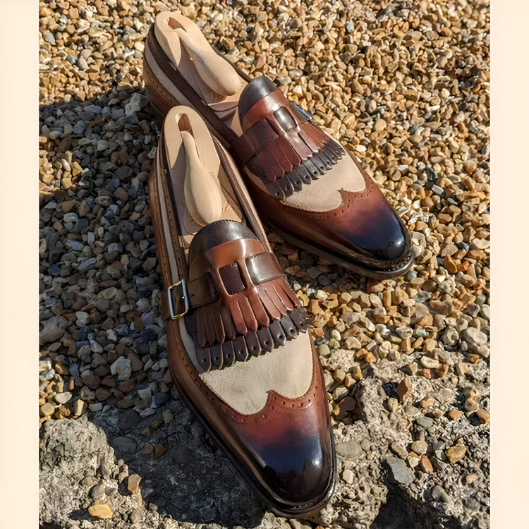 Step up your style game with our Brown Italian Leather and Beige Libraria Tassel Loafers. These versatile shoes feature a monk strap and tassel detail for a touch of elegance. Made with high-quality Italian leather, they offer both comfort and sophistication. Elevate any outfit with these classic loafers.