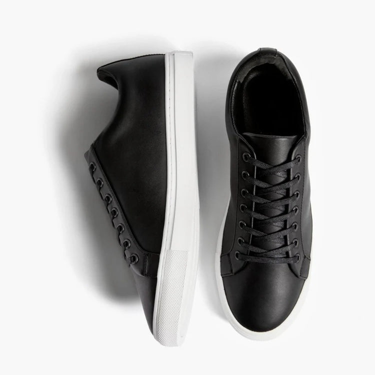 Black Leather Low Top Lace Up Sneakers with White Sole - Sneaker Shoes