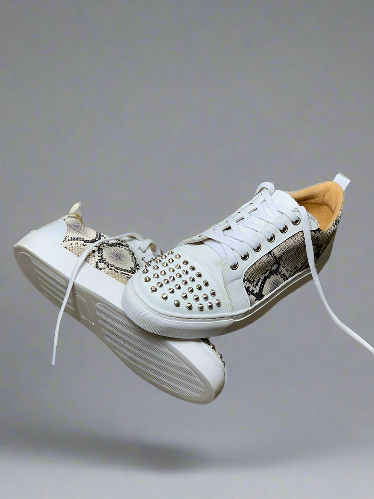Expertly crafted with white leather and snack pattern leather, these low top sneakers feature a lace up design and white sole. Perfect for any casual occasion, these sneakers offer comfort and style with their unique pattern and durable materials. Upgrade your sneaker game with these must-have shoes.