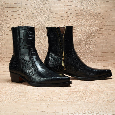 Black Croc Print Leather Fiorina Slip On Zipper Pointed Boots for Men - Boots