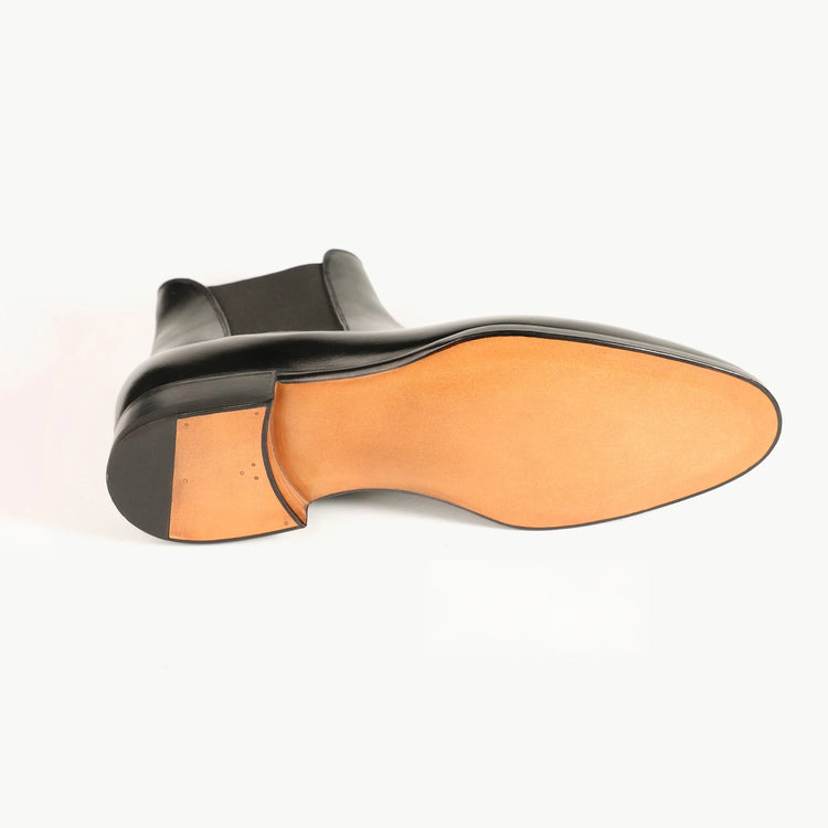 The upper is made from one single piece of calfskin which is blocked into shape to reduce the stitching to only a seam in the back. The pattern is cut tight around the ankle to make sure the boot sits nicely on your foot, still the elastic inserts allow for enough stretch to enter the boot.