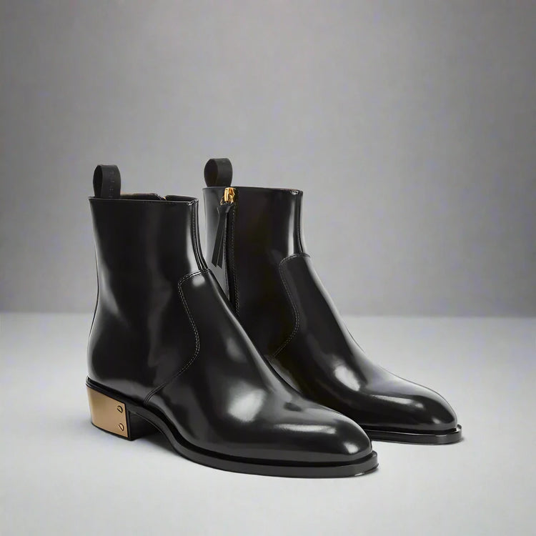 Update your boot collection with these sleek black leather Chelsea boots. Featuring a convenient zipper closure and stylish golden heel plate, these boots combine fashion with practicality. Slip them on with ease and elevate any outfit with these versatile Chelsea boots.