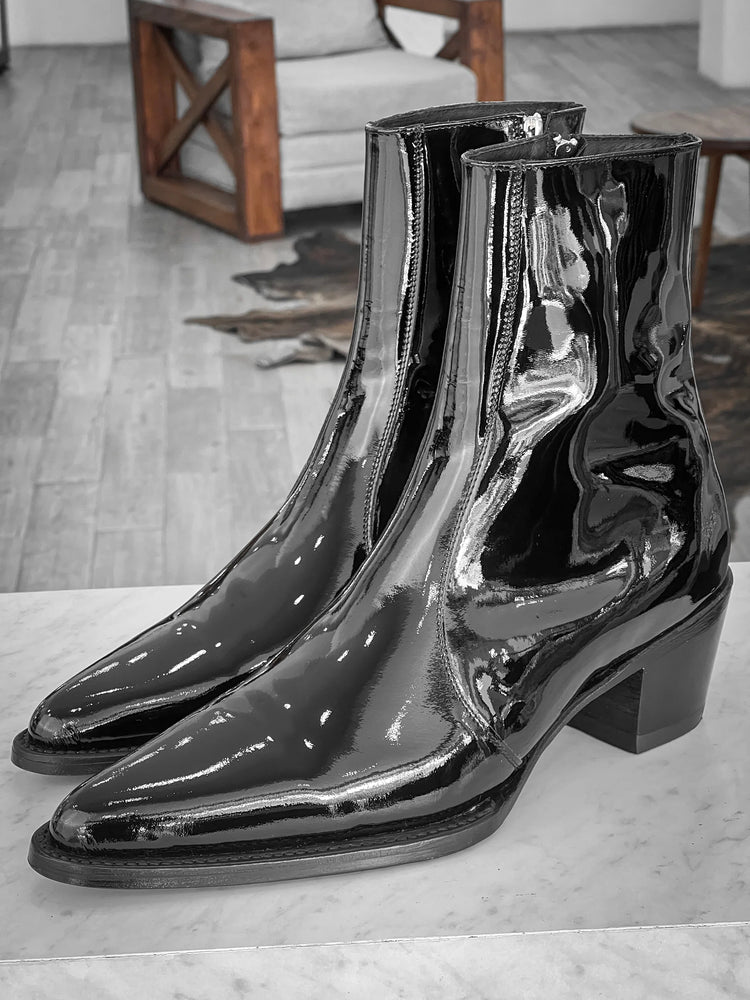 Step into refined elegance with these black patent leather Chelsea boots, designed for the discerning individual. The sleek pointed toe silhouette exudes contemporary sophistication, while the convenient side zipper ensures effortless on-and-off wear. Crafted from lustrous patent leather, these slip-on boots deliver a polished finish that transitions seamlessly from professional settings to evening occasions. The Chelsea construction provides a secure, comfortable fit without compromising on style. A timeless investment piece that elevates any wardrobe with understated luxury.