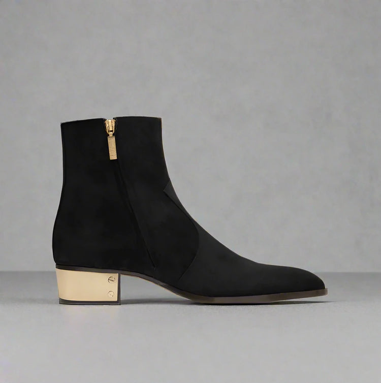Effortlessly stylish and comfortable, our Black Suede Leather Chelsea Boots feature a convenient slip-on design with a zipper for easy wear. The golden heel plate adds a touch of elegance to these versatile boots that can be dressed up or down for any occasion. Stay on trend with these timeless Chelsea boots.