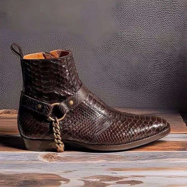 Brown Crocodile/Python Print Italian Leather Wanton Slip On Harness Chelsea Boots - Chelsea Boots