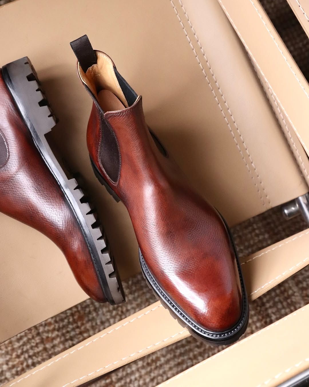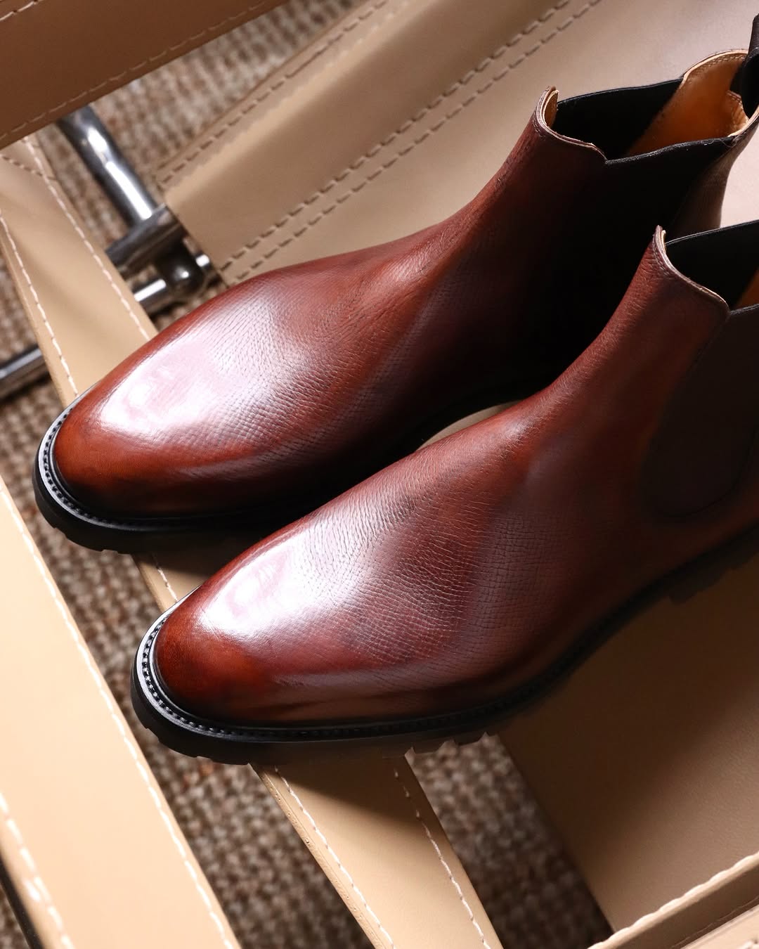 Crafted from supple Italian leather, these Chelsea boots marry timeless elegance with effortless style. The slip-on design eliminates fussy lacing, while the rounded toe offers refined comfort for all-day wear. Rich brown tones complement any wardrobe, from tailored trousers to casual denim. A sophisticated choice for those who appreciate quality craftsmanship and understated luxury in their footwear collection.