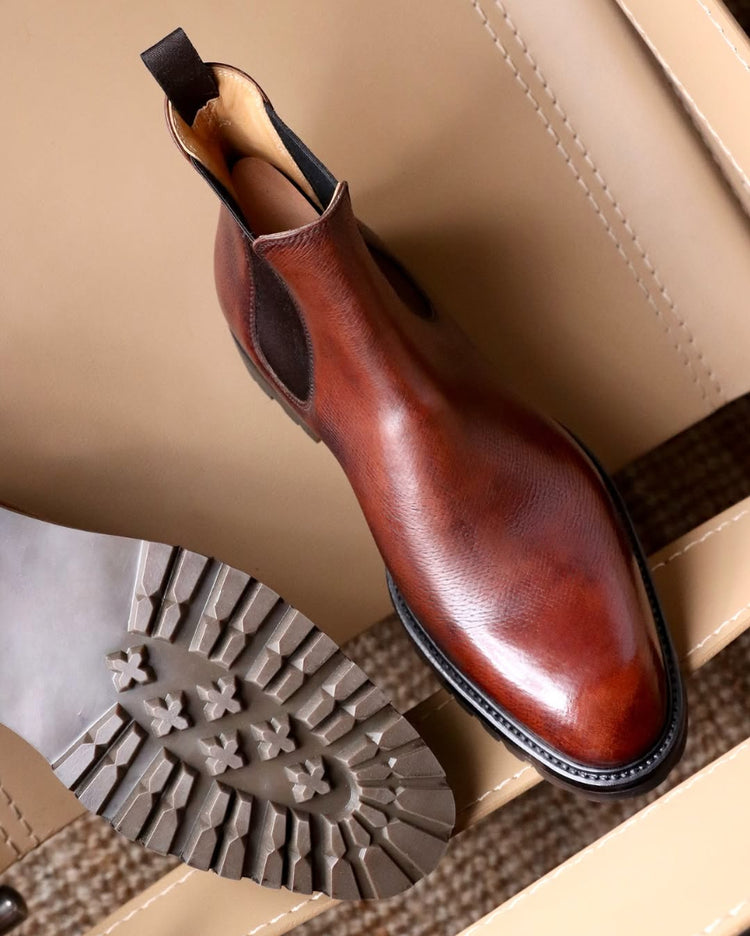 Brown Italian Leather Slip On Round Toe Chelsea Boots - Boots