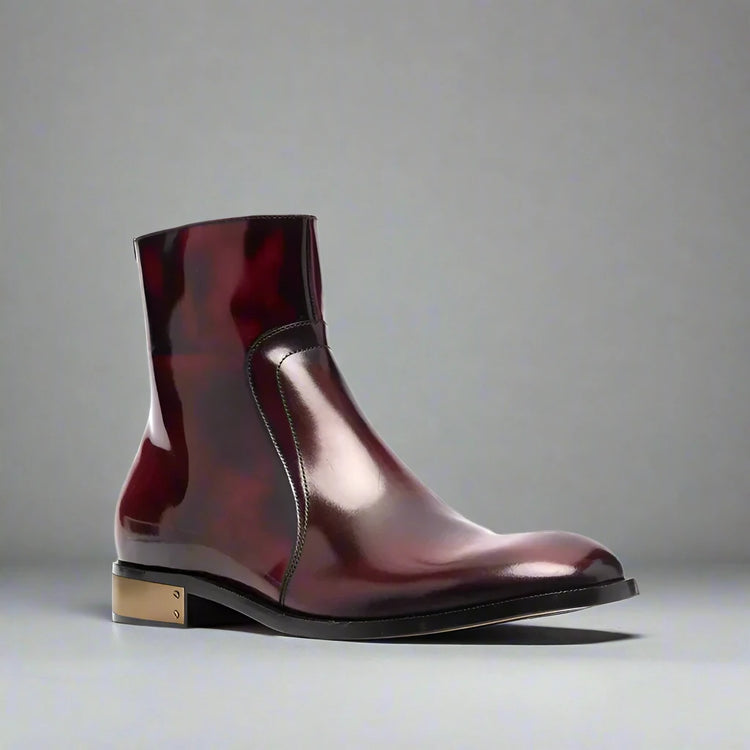 Effortlessly elevate your style with our BURGUNDY LEATHER SLIP ON MODENA CHELSEA BOOTS. Featuring a convenient zipper, these boots are both stylish and practical. The golden heel plate adds a touch of sophistication to complete your look. Step out in confidence and comfort with our CHLESEA BOOTS.