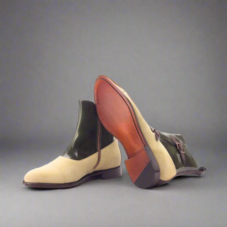 Green Italian Leather Campinas Slip On Zipper Boots With Beige Suede Leather Patina - Boots