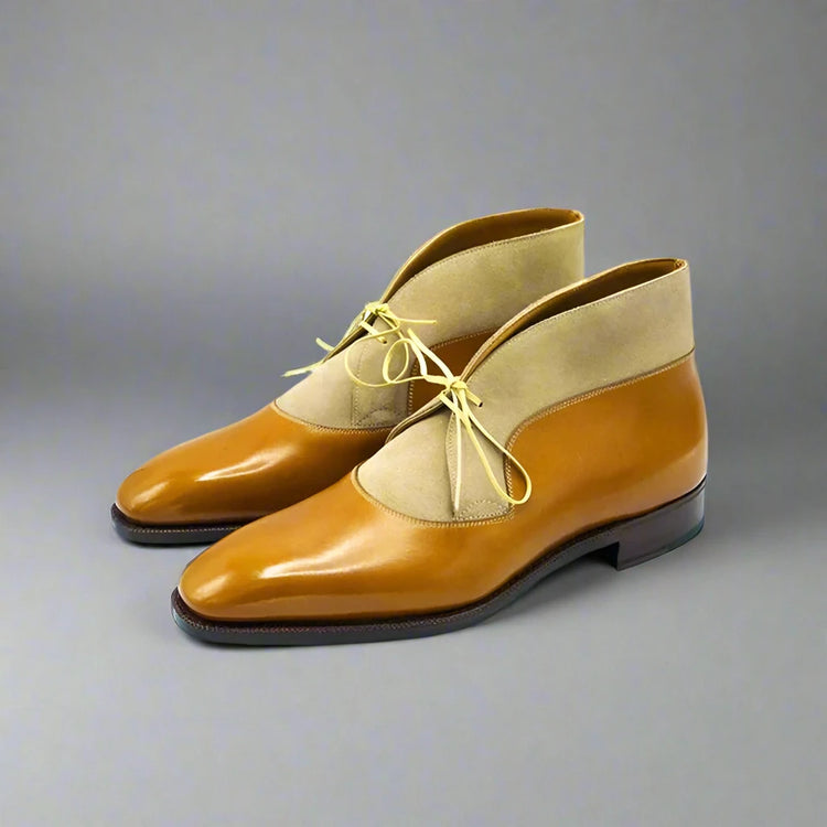 Crafted with a blend of durable tan leather and soft suede, these Vermient lace-up boots are a stylish and versatile choice. With a comfortable fit and secure laces, these boots are perfect for all-day wear. Elevate any outfit with these expertly crafted boots.