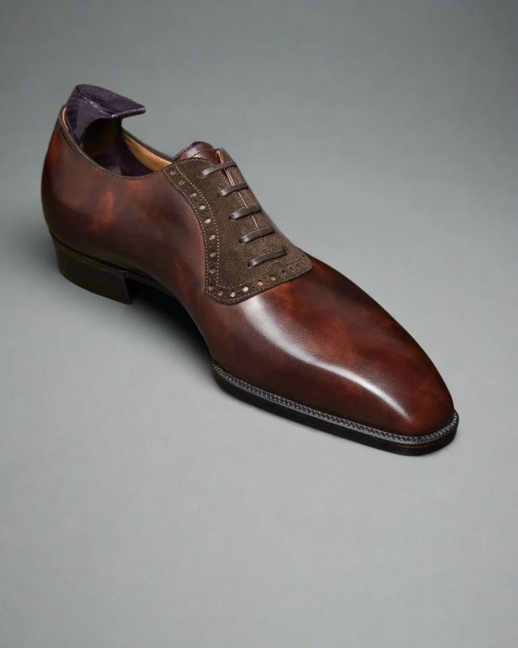 Expertly crafted with a brown leather patina and suede, the Lysander Brogue Oxfords are the epitome of style and sophistication. These formal shoes exude quality and class, making them the perfect addition to any wardrobe. With their unique design and luxurious materials, these shoes are sure to impress.
