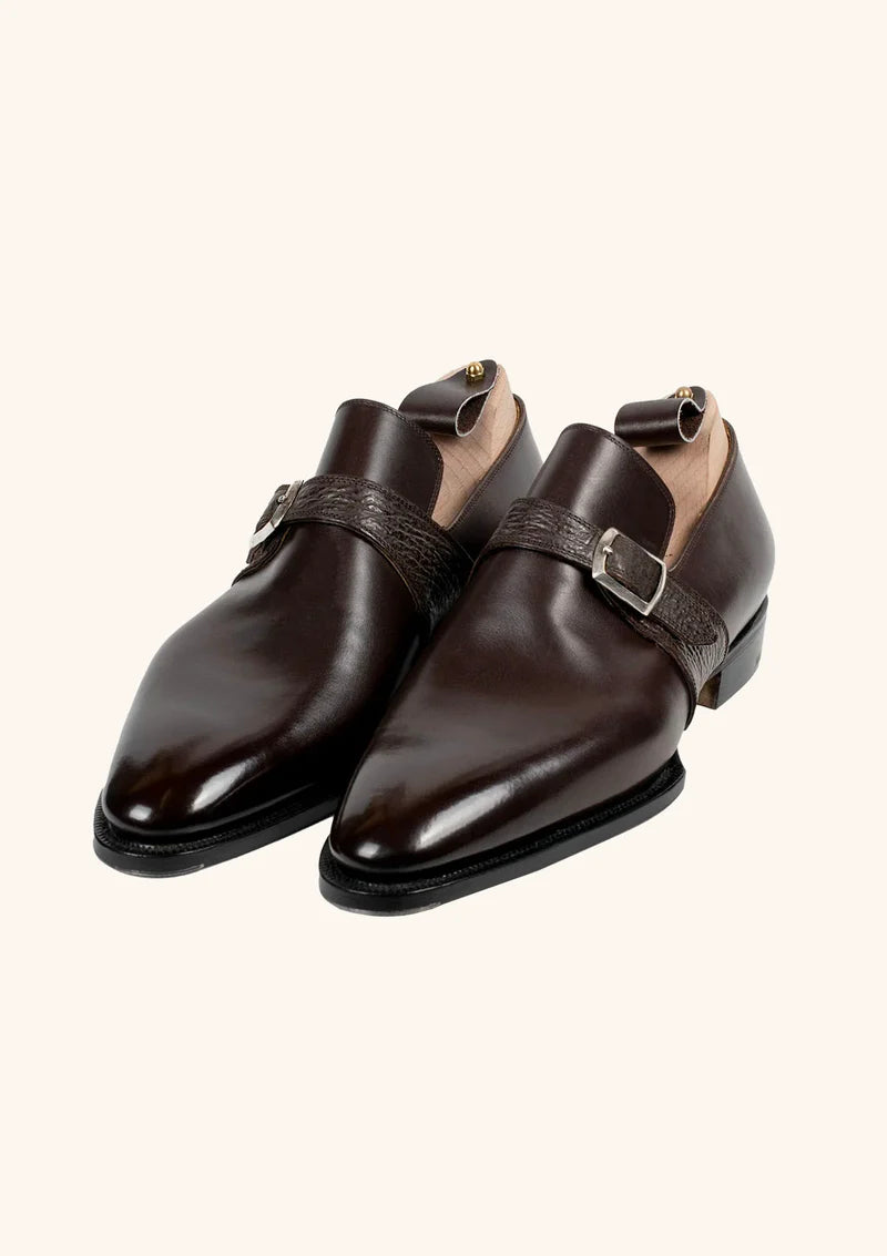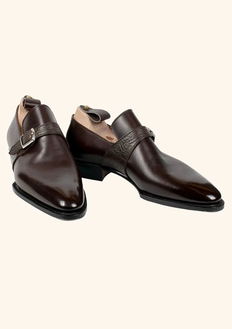 Elevate your formal wardrobe with these distinguished Dark Brown Arca Leather Monk Strap shoes. Crafted from premium leather, these sophisticated footwear pieces feature a refined single buckle design that exudes timeless elegance. The monk strap construction offers both style and practicality, ensuring a secure fit with effortless adjustability. Perfect for business meetings, formal events, or refined everyday wear, these shoes seamlessly transition from office to occasion. The rich dark brown hue pairs beautifully with tailored suits and dress trousers, making them an essential addition to any discerning gentleman's collection.