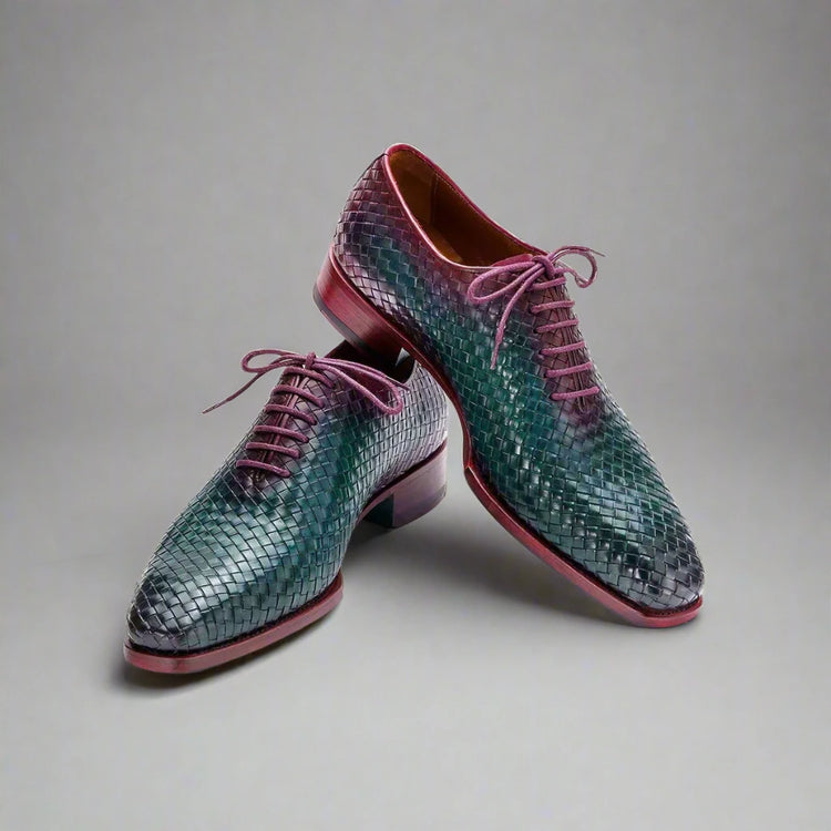 Expertly crafted with a blue patina braided leather design, these brogue oxfords exude both style and sophistication. Perfect for formal occasions, their intricate detailing and elegant color will elevate any outfit. Step out in confidence and make a statement with these luxurious shoes.