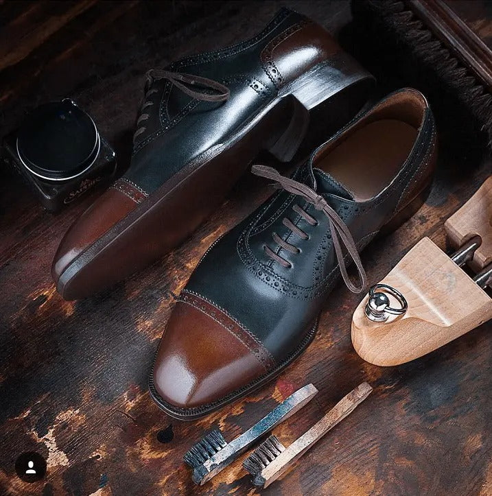 Men’s Two Tone Green & Brown Leather Toe Cap Lace Up Fine Shoes - Formal Shoes