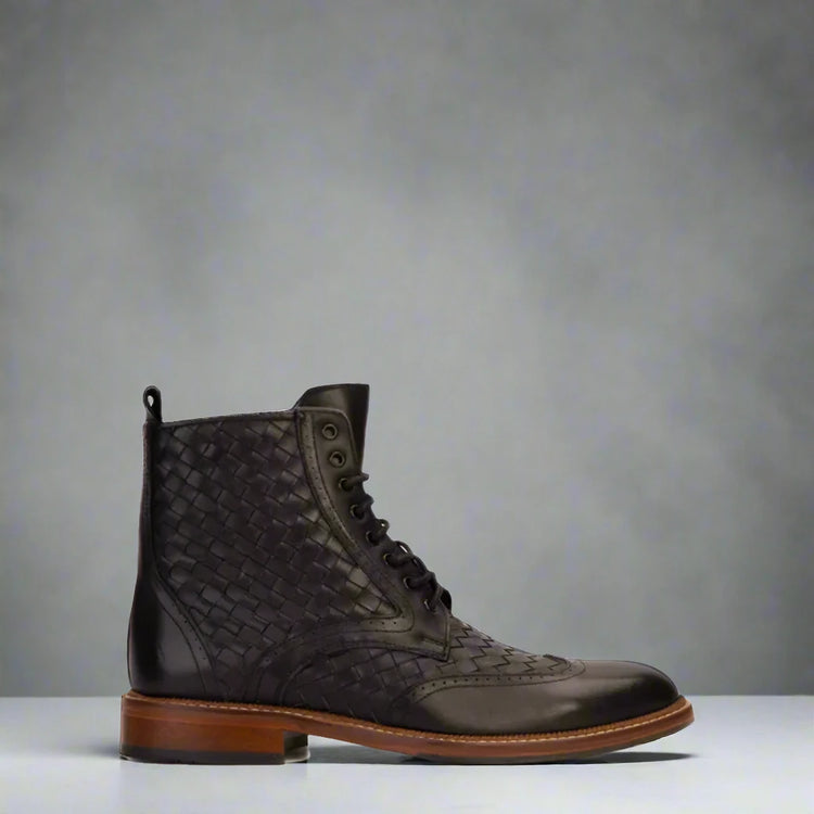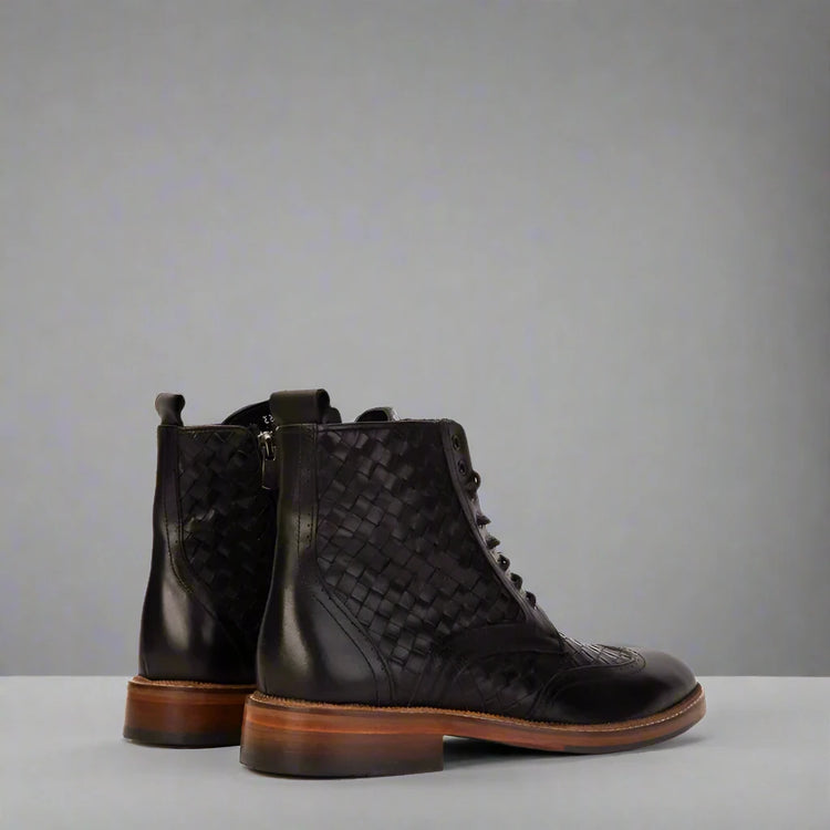 Black Leather Braided Barletta Lace Up Brogue Wingtip Oxford Boots - Boots