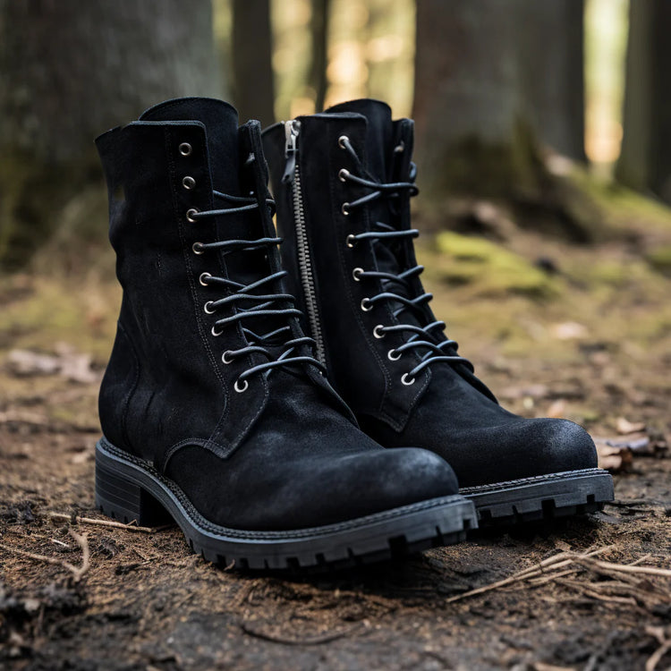 Black Suede Valeria Lace Up Zipper Derby Boots with Track Sole - Boots