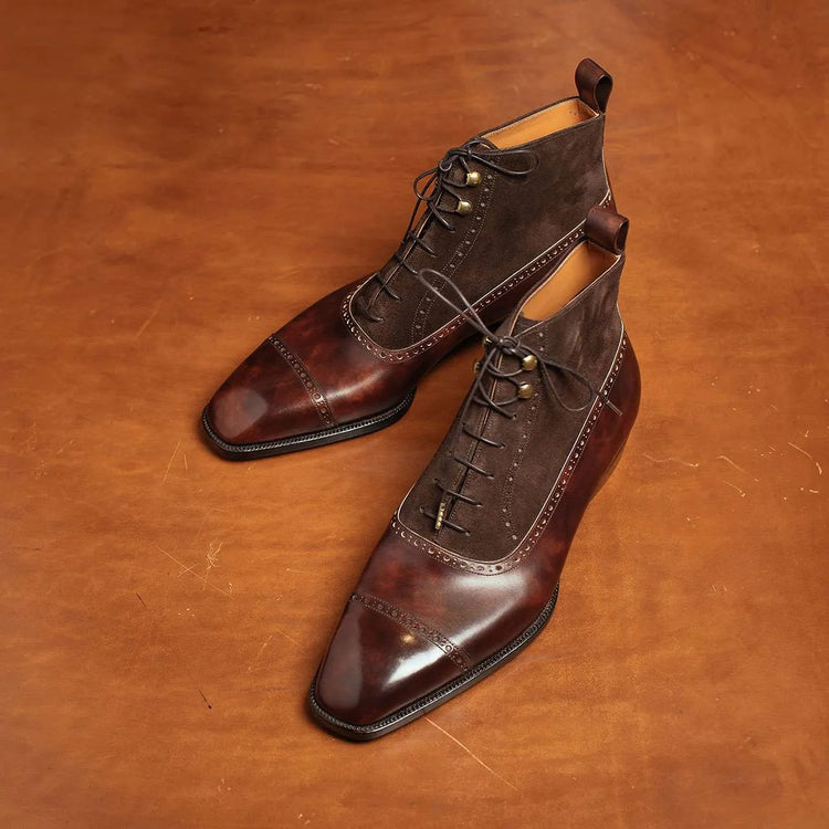 Brown Leather Patina and Suede Orvieto Lace Up Brogue Oxford Boots - Boots