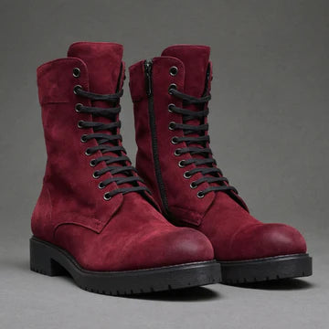 Burgundy Suede Leather Oriella Lace Up Chunky Derby Boots with Zipper and Track Sole - Hiking and Trekking Boots