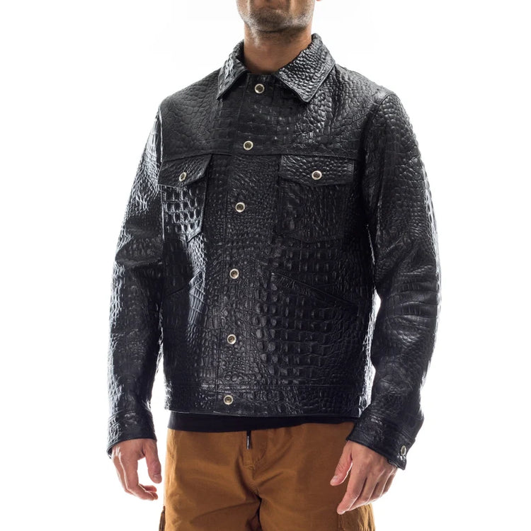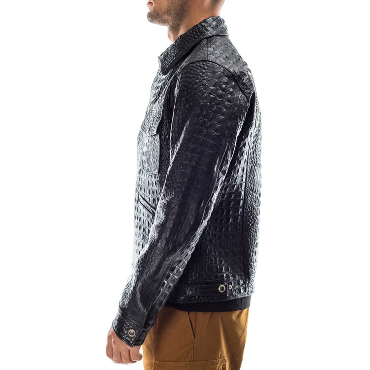 Italian handmade Men Black Italian leather jacket embossed alligator crocodile texture - Leather Jackets