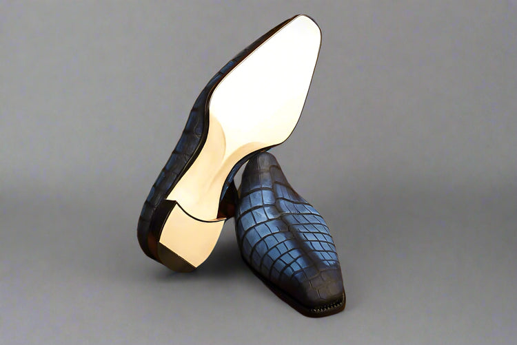 Step into timeless style and comfort with these Navy Blue Croc Leather Penny Loafers. Crafted from premium croc-embossed leather, they offer a sleek, sophisticated look that effortlessly complements both casual and formal outfits. The slip-on design ensures easy wear, while the durable sole provides reliable support throughout your day. Perfect for those who value elegance and convenience in their footwear.