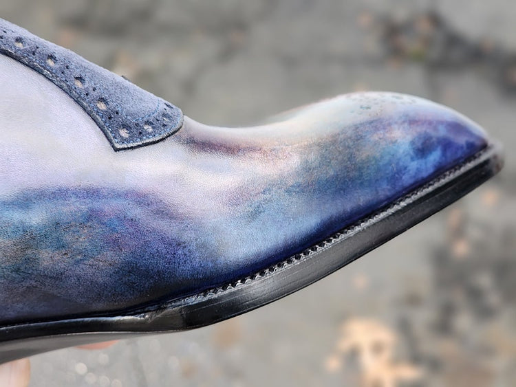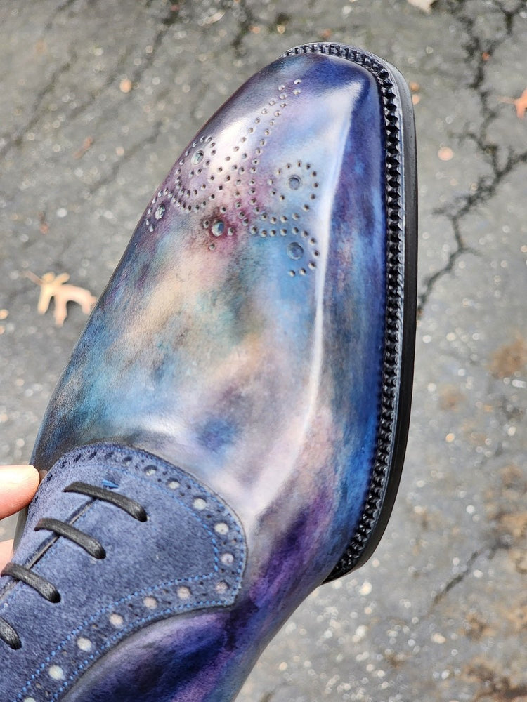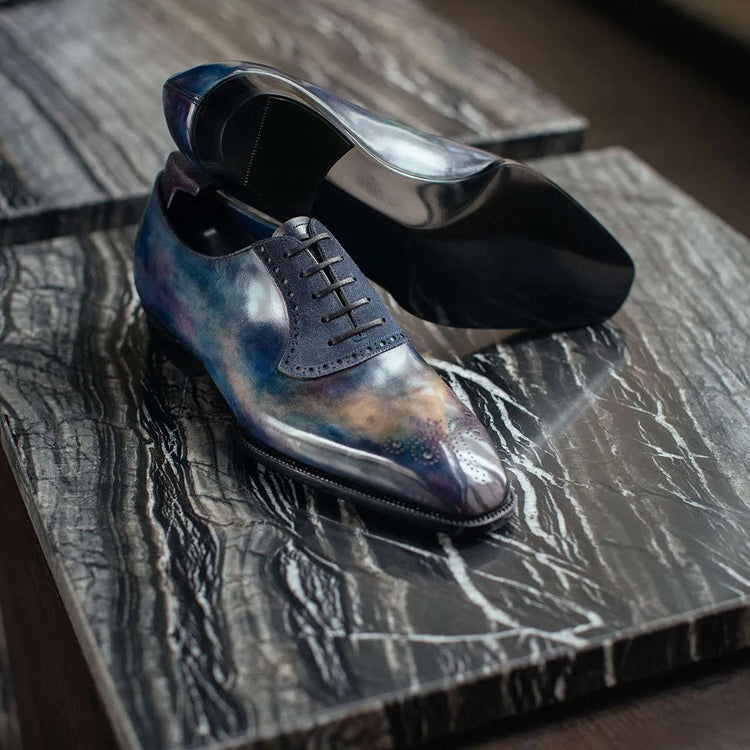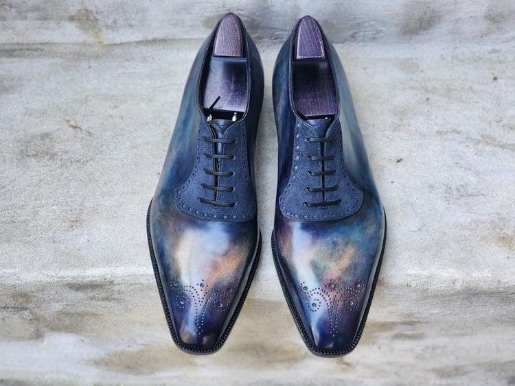 Discover the ultimate in luxury with our Blue Leather And Suede Isolde Brogue Patina Finish Oxfords. Crafted with the finest materials, these formal shoes offer a unique blend of style and comfort. Experience the perfect balance of sophistication and elegance with our Luxury Addition collection.